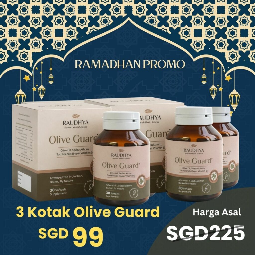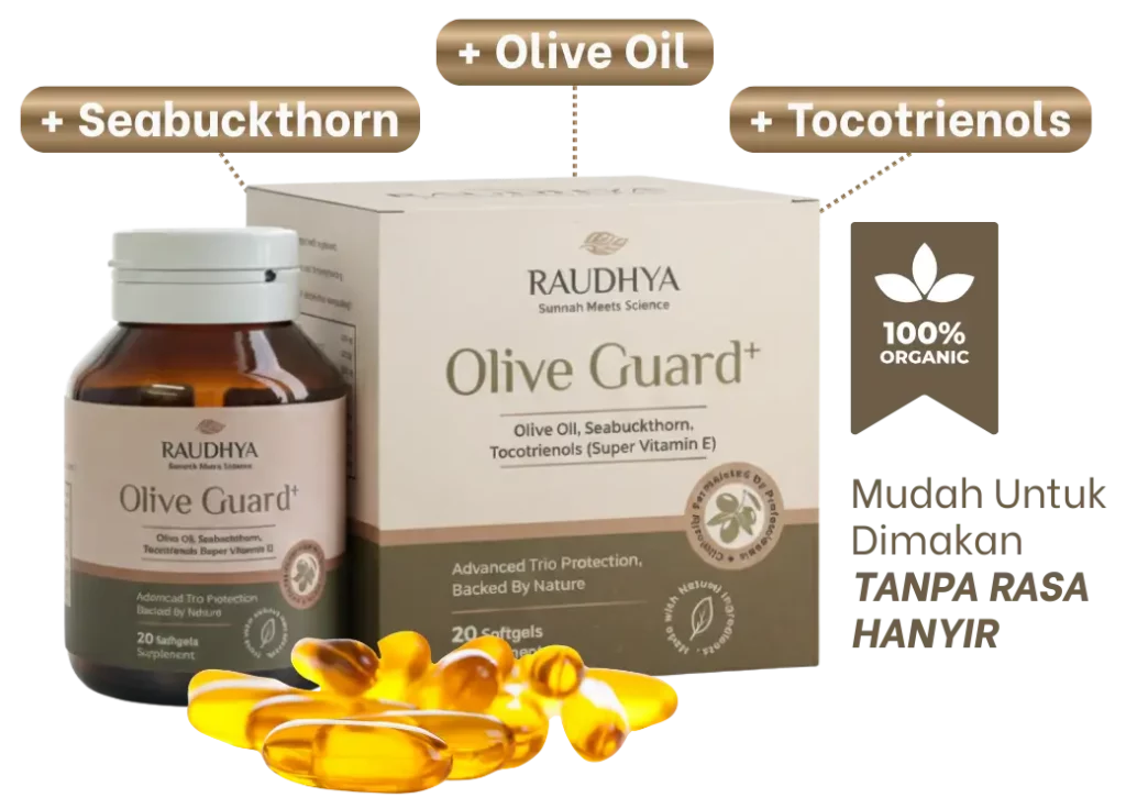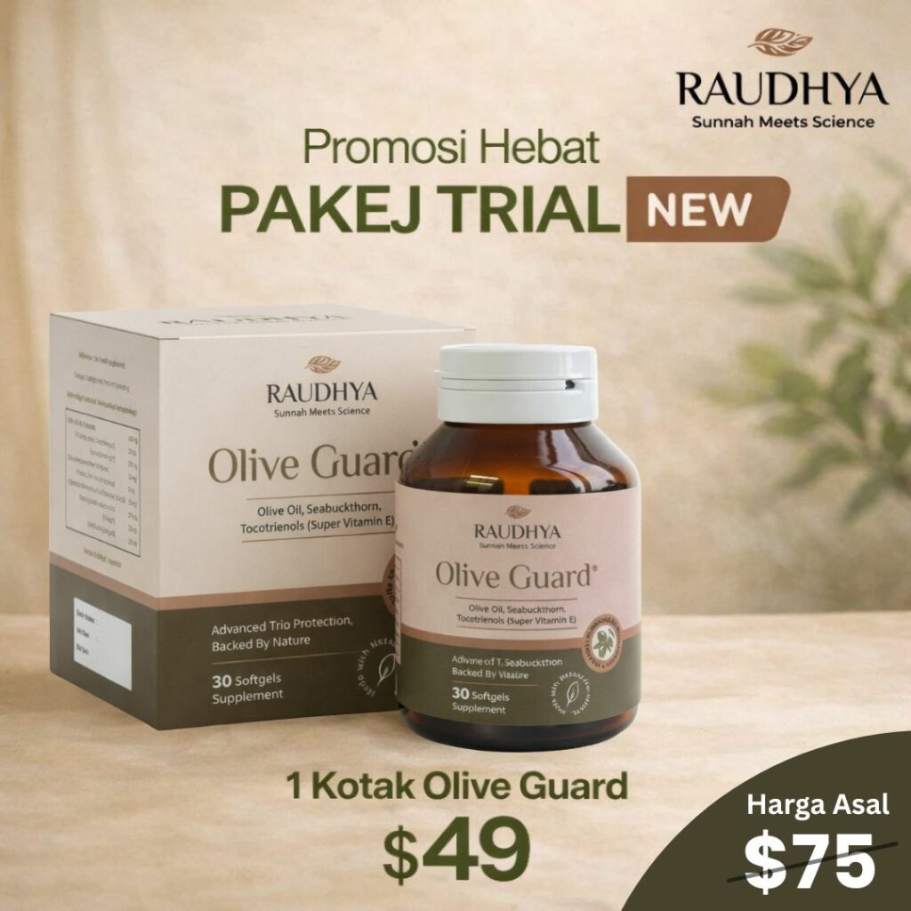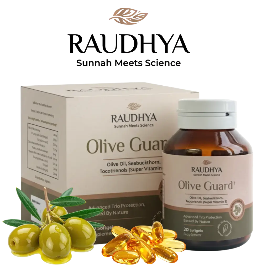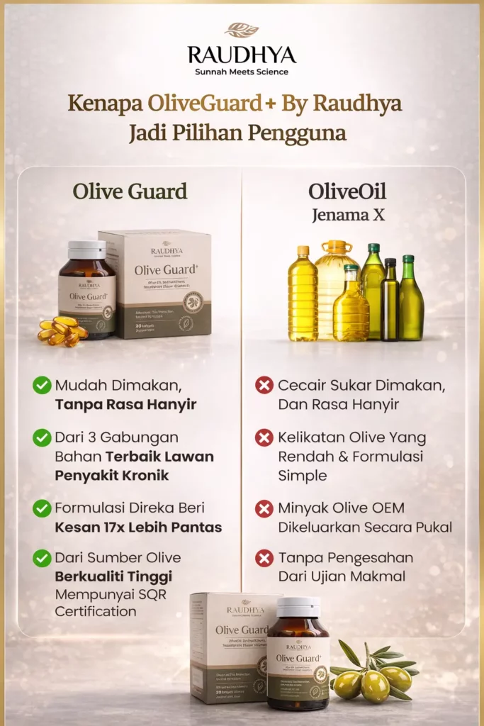 Raudhya OliveGuard+ Diperkaya Bahan Aktif Polyphenols, Tocotrienols (Super Vitamin E) & Omega Aktif Menyokong Kawalan Gula, Kolesterol & Tekanan Darah