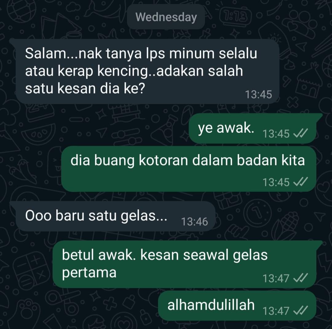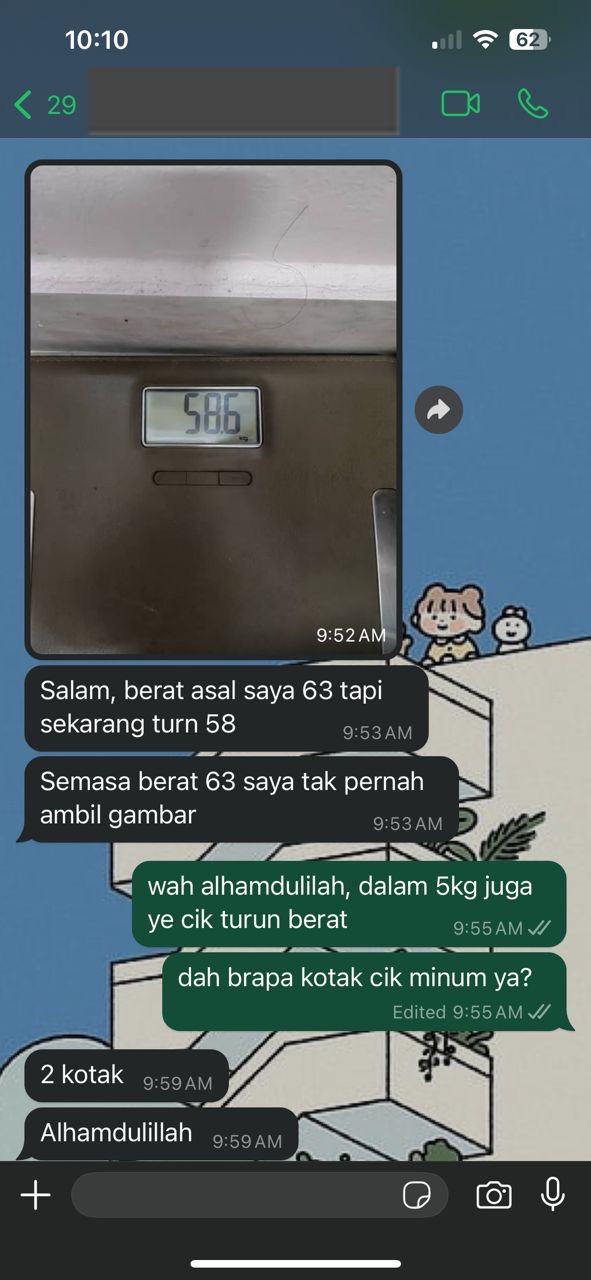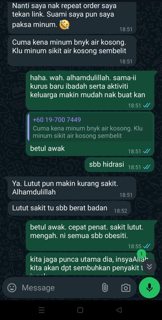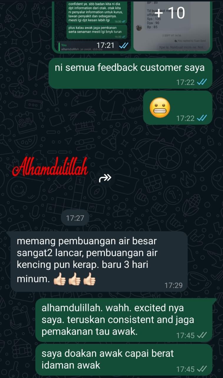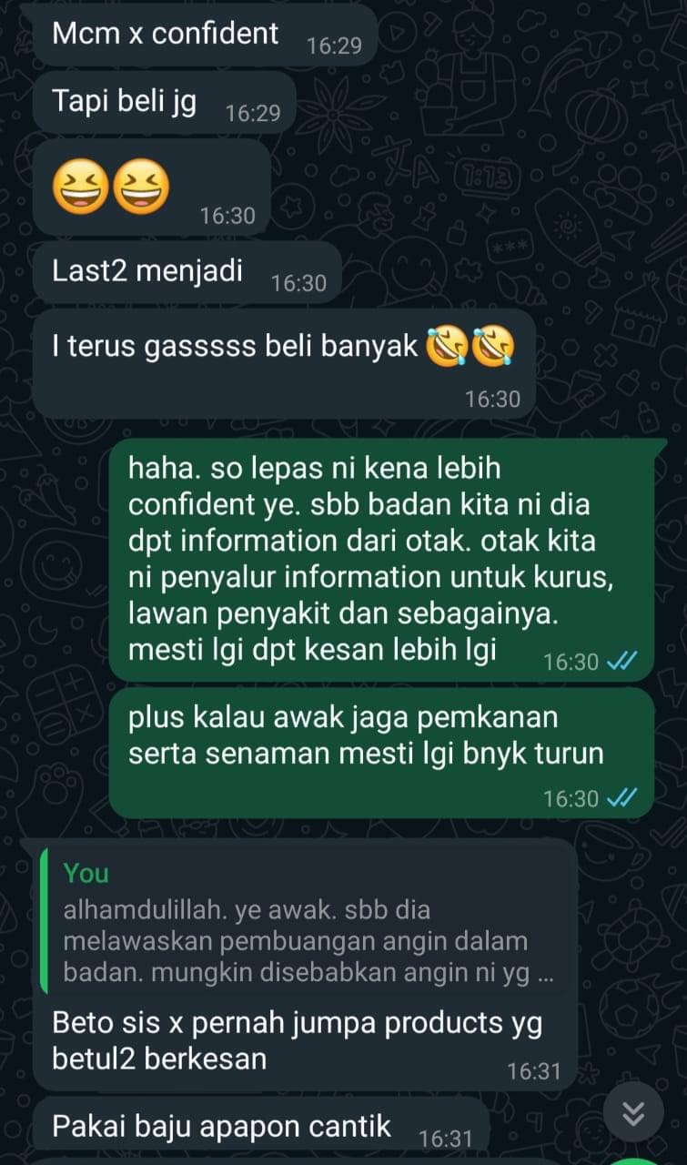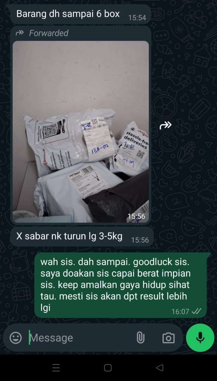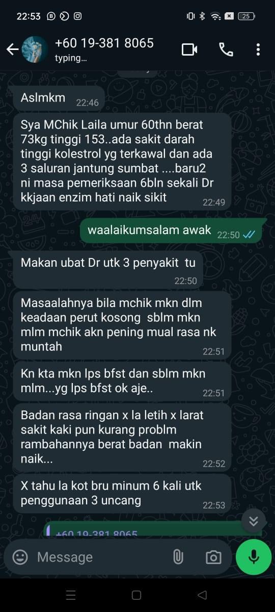 “Berat saya turun 8kg Selepas Amal 3 Kotak, hairan saya, kat mana hilang lemak sebab takde cirit birit, tapi yang saya perasan selera makan saya berubah, buang air besar lawas, paling best! Gout saya eh tibe tibe hilang!” – En. Mustam.